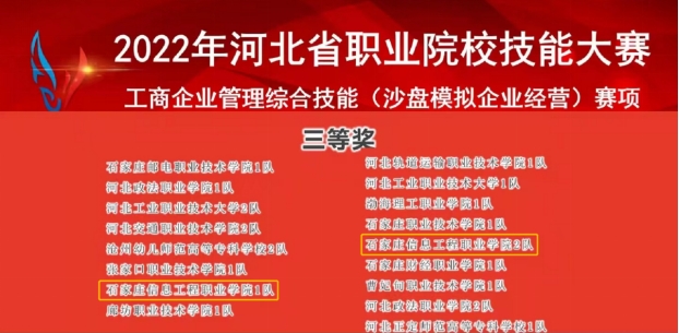 由河北省教育厅主办、河北省现代服务业职业教育集团承办的2022年河北省职业院校学生技能大赛(高职)工商企业管理综合技能(沙盘模拟企业经营)大赛以线上竞赛的方式举行。我院会计系周同瑶老师和王丽莉老师,带领大数据与会计专业董冰茜、杨笑雨、崔亚南、钱思羽、徐敬5名同学组成的bwin必赢1队,和方俊杰、贾一卓、吴东旺、李兆康、叶微5名同学组成的bwin必赢2队分别荣获三等奖。