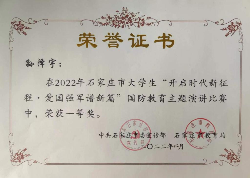 2022年10月,石家庄市委宣传部、石家庄市教育局在全市高校范围内开展了“复兴强国有我”2022年石家庄市大学生“开启时代新征程·爱国强军谱新篇”国防教育主题演讲比赛,我院团委经过层层筛选,组织了四名学生参赛。比赛结果喜人,参赛的四名同学2021级管理系旅游管理3班孙泽宇、2021级网络与通信工程系现代通信1班李炜、2021级计算机应用系人工智能技术应用2班李函隽、2021级管理系旅游管理2班郝子昀全部荣获一等奖,张琰老师荣获“优秀辅导教师”。