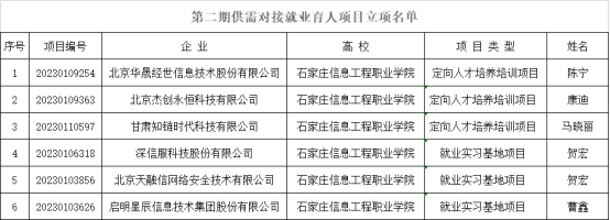 近日,教育部发布《教育部高校学生司关于公布第二期供需对接就业育人项目立项名单的通知》(教学司函〔2023〕6号),我院6个项目获批立项,其中定向人才培养培训项目3项、就业实习基地项目3项。