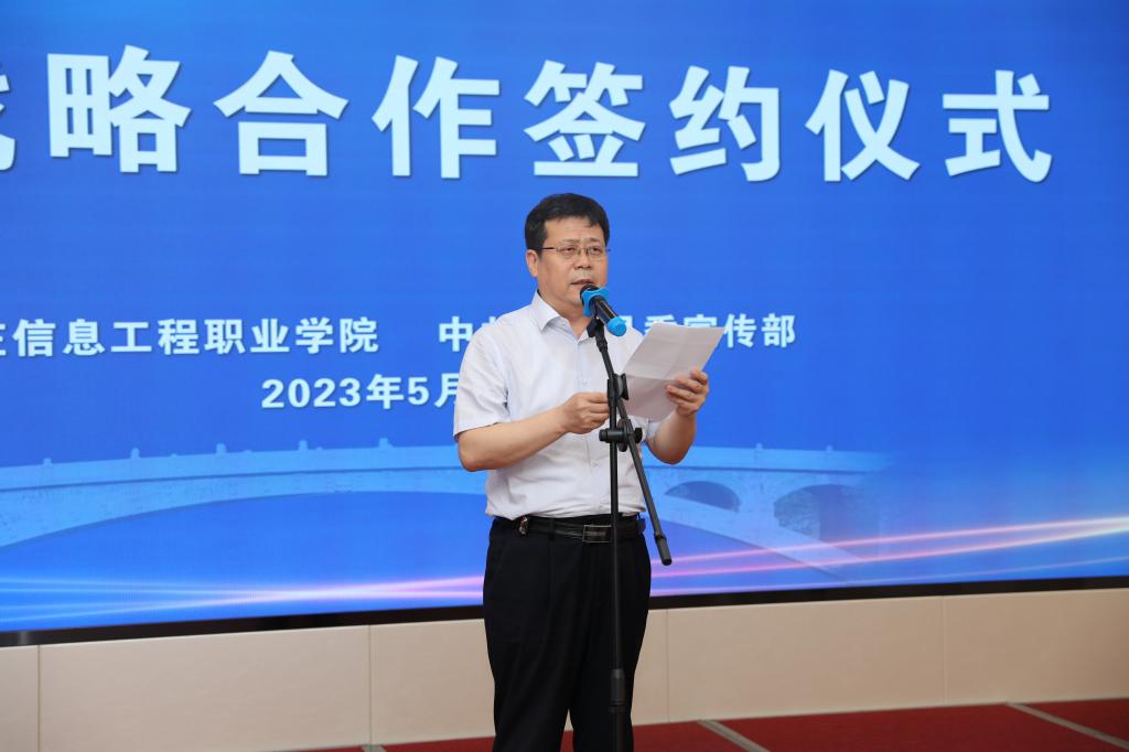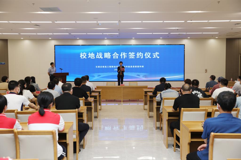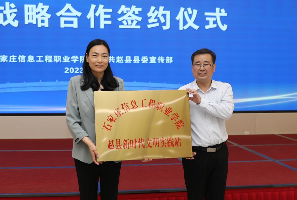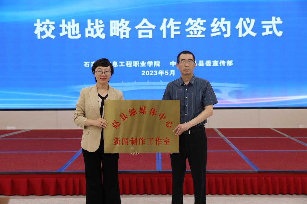 5月17日,我院与赵县县委宣传部在赵县赵州城市综合馆举行校地战略合作签约授牌仪式,联合开启非遗文化传承与新时代文明实践、融媒体建设联合发展新模式。学院副院长赵伟,党委委员、组宣部部长范成宝以及赵县县委常委、宣传部部长王晓冉、常务副部长翟胜芳、副部长徐哲普、王建立出席签约仪式。翟胜芳主持仪式。