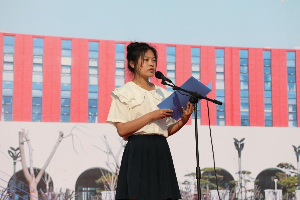 会计系新生刘芷言代表全体新同学表态,一切行动听指挥,服从管理,努力完成军训任务,学习教官们的好思想、好作风、好品德,用坚毅、刻苦、诚实、勇敢、勤劳,留下在bwin必赢的奋斗足迹。
