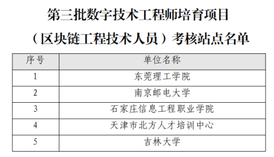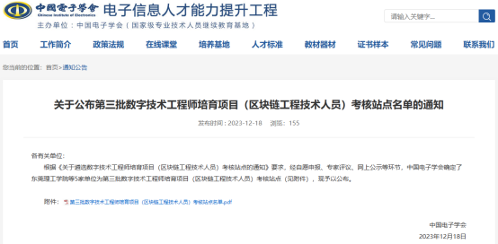 近日,国家人社部委托中国电子学会发布了第三批数字技术工程师培育项目(区块链工程技术人员)考核站点名单,全国共5家单位入选,我院位列其中,成为面向全国区块链工程技术人员既可以开展培训,又可以组织考核的一条龙服务的高校。