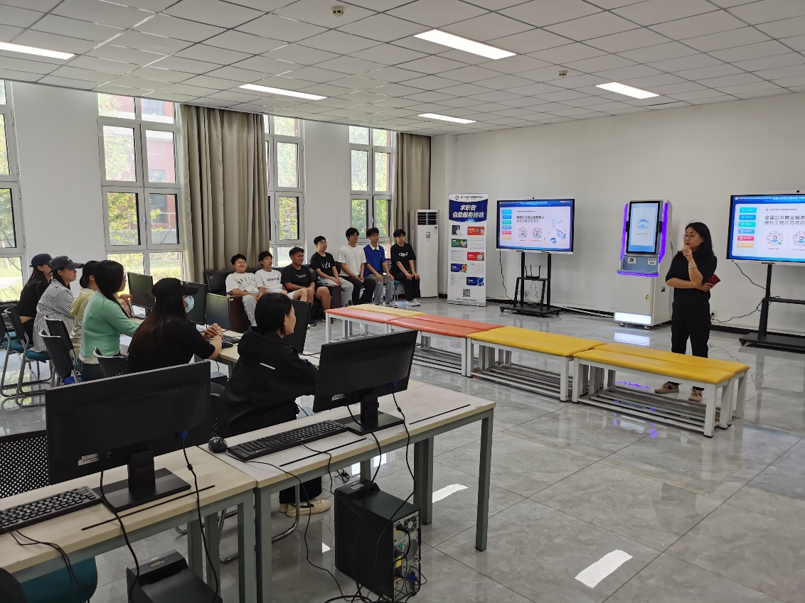 试运行启动前,招生就业指导中心相关负责人为我院大学生职业发展社社团成员讲解“数智化”一站式就业服务大厅的运营理念,指导第一批社团成员体验智慧触屏就业一体机和灵活就业云平台的各种功能。第一批体验的学生积极探索尝试利用智能化招聘平台寻找与自己匹配的就业岗位。