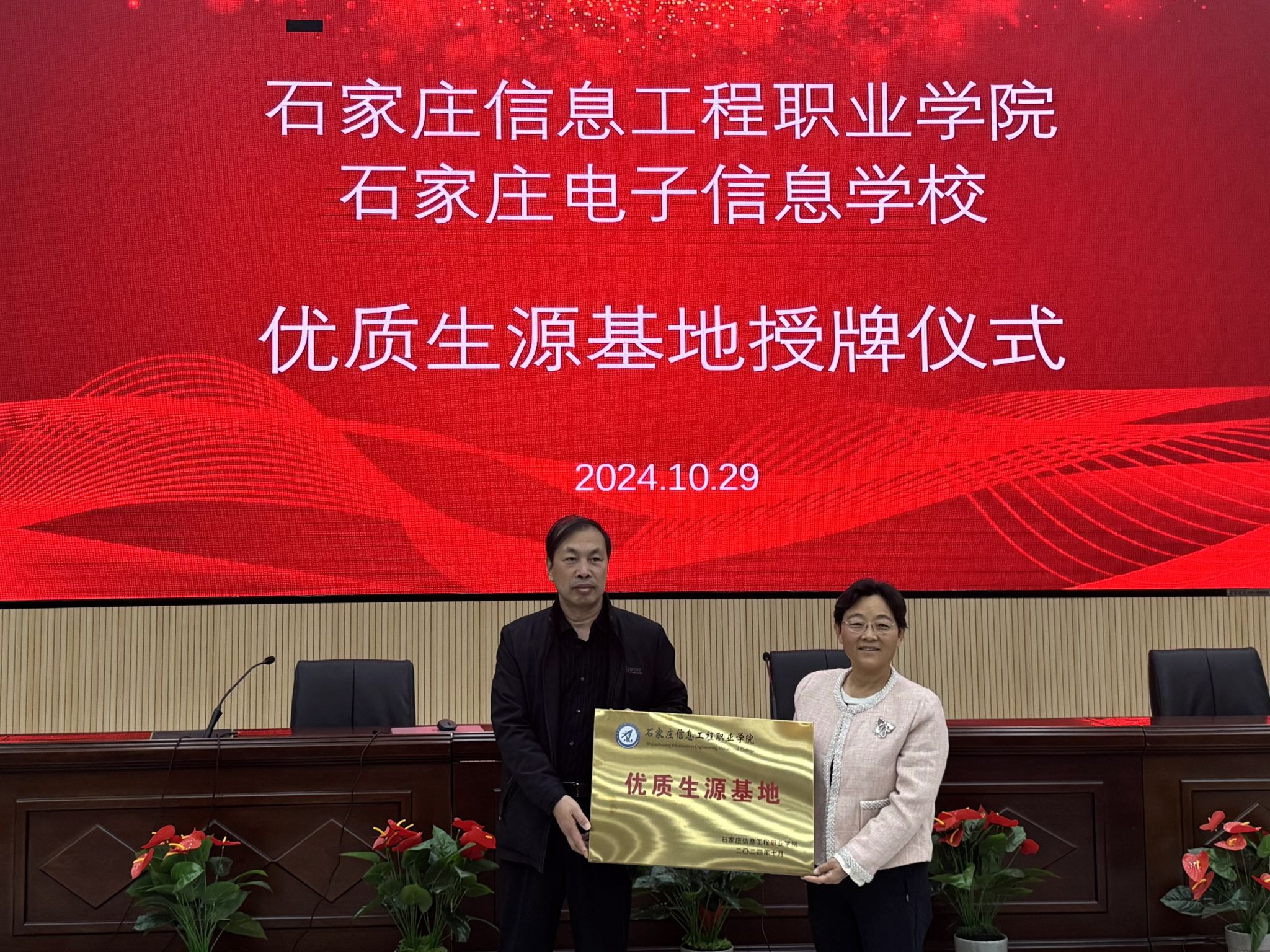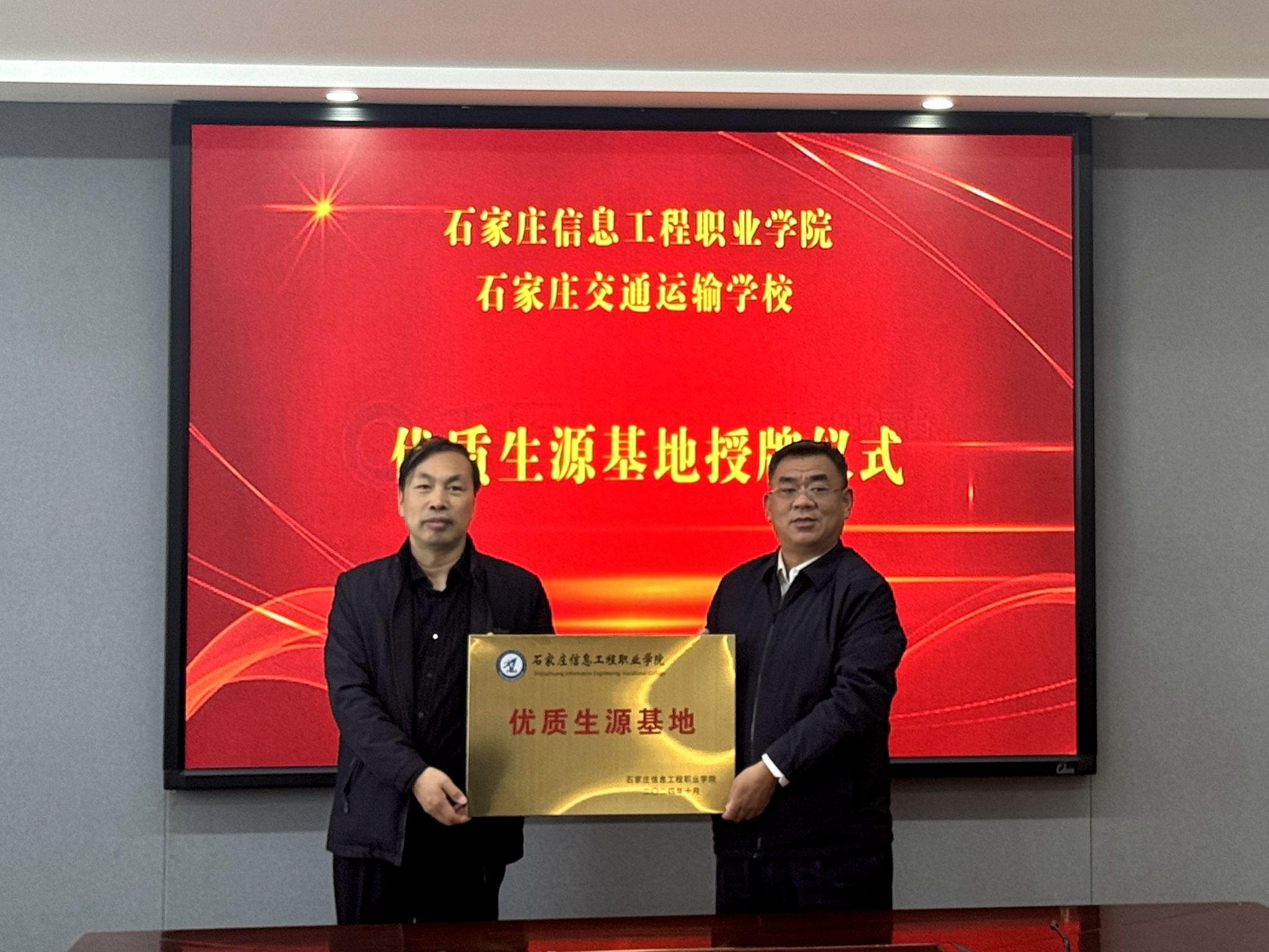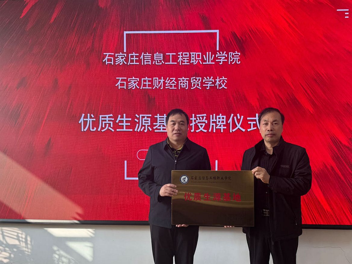 为加强与中职学校深度合作,持续提升学院生源质量,10月29日,学院副院长刘占红来到石家庄电子信息学校、石家庄交通运输学校、石家庄财经商贸学校参加“优质生源基地”授牌仪式,并代表学院向三所中职学校授牌。石家庄电子信息学校党委书记刘丽燕、石家庄交通运输学校党委书记张新峰、石家庄财经商贸学校副校长袁凌华参加仪式。