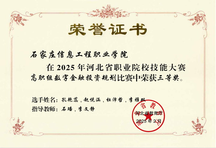 近日,会计系学生在2025年河北省职业院校技能大赛(高职组)“数字金融投资规划”赛项中荣获三等奖。