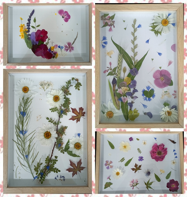 活动过程中,同学们根据所学压花技术,分工有序,有的负责采摘挑选花材,有的负责在纸面上设计、勾勒出作品的雏形,经过裁剪摆放,采用脱水、保色、压制和干燥等处理工艺,在自然与灵感的碰撞中,一幅幅精美的装饰画、书签等作品呈现在大家的眼前。活动的最后,同学们互相欣赏作品,彼此交流经验,分享着各自的创作思路。