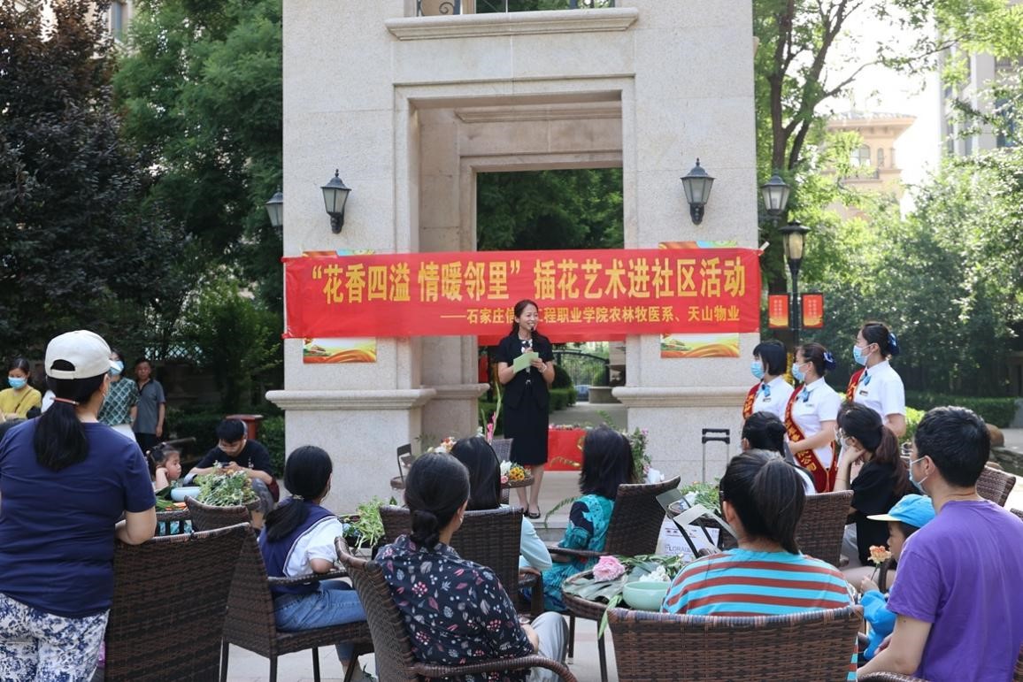 为大力宣传工匠精神,弘扬劳动光荣、技能宝贵的时代风尚,向全社会宣传职业教育改革发展成果,5月28日下午,农林牧医系走进正定天山熙湖社区,开展“职教宣传进社区 专业技能惠民生”主题活动,为社区居民传授了插花艺术技巧与宠物养护知识。