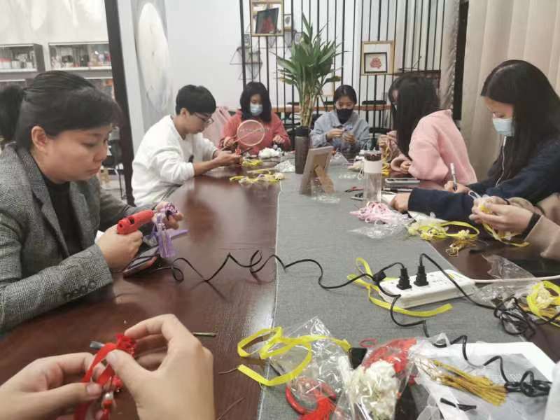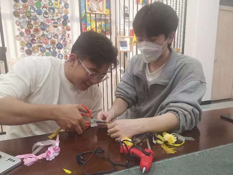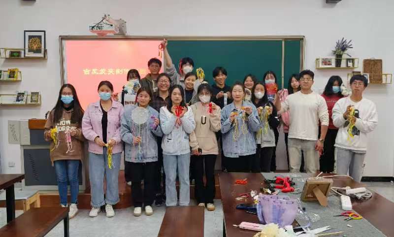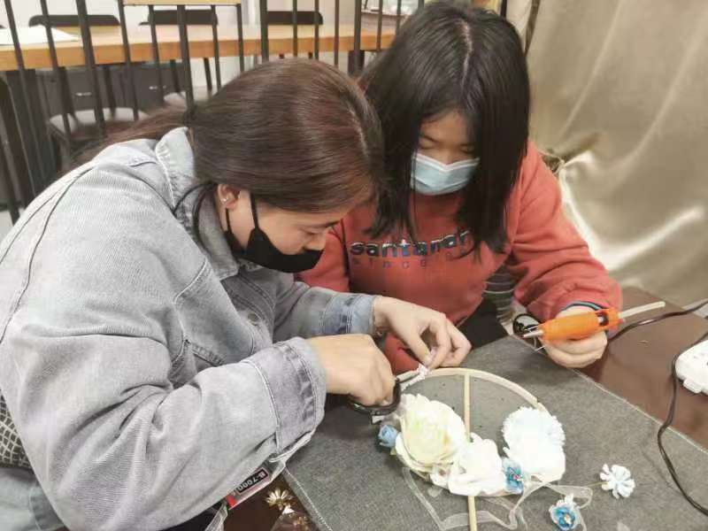 晚上7时许,知新7号楼124教室灯火通明,来自学院各系的20余名同学沉浸在手作的快乐之中。同学们按照各自所需挑选材料,精心设计制作属于自己的古风发饰。一条条五颜六色的流苏,一颗颗圆润璀璨的彩珠,一朵朵造型各异的绢花,通过设计、拼贴、上胶等工序,变成了独具特色的发夹、发簪、团扇。看着自己精心制作而成的汉服配饰,大家激动和愉悦的心情溢于言表。