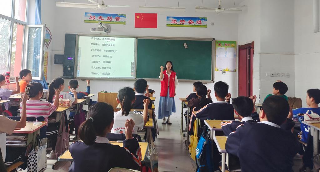 我院学生化身小老师开展教学活动。教室里,22级旅游管理三班孙汶慧、22级会计9班宋璐阳认真教导学生发音,带领学生朗诵《请党放心,强国有我》,同学们慷慨激昂,深情并茂,铿锵有力的朗诵声在耳边回响,激情澎湃的爱国情怀在心头荡漾。操场上,22级软件五班韩璐萱、梁鑫玉耐心指导学生的动作,欢快的音乐声《向快乐出发》响起,孩子们伴随着动感的节奏快乐的舞蹈,稚气的脸上露出灿烂的笑容,一举一动展现出少年的蓬勃朝气。