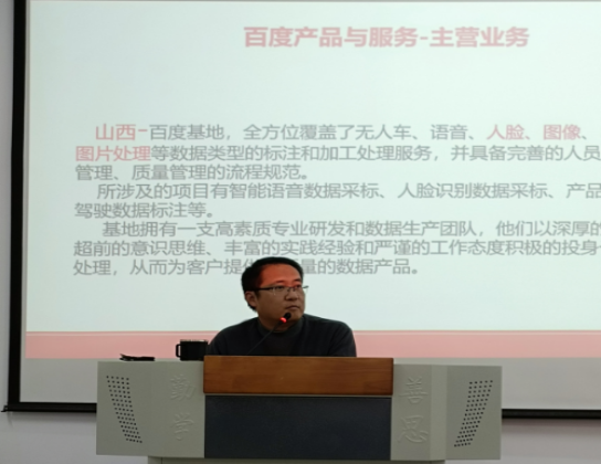 12月21日下午,软件工程系邀请百度数据基地山西节南山网络科技有限公司在知海1号楼228举行毕业生就业宣讲。根据本次宣讲的专业类别和地区特点,软件工程系特别邀请了计算机应用系、网络与通信工程系山西籍及相关专业共计110余名学生参加。