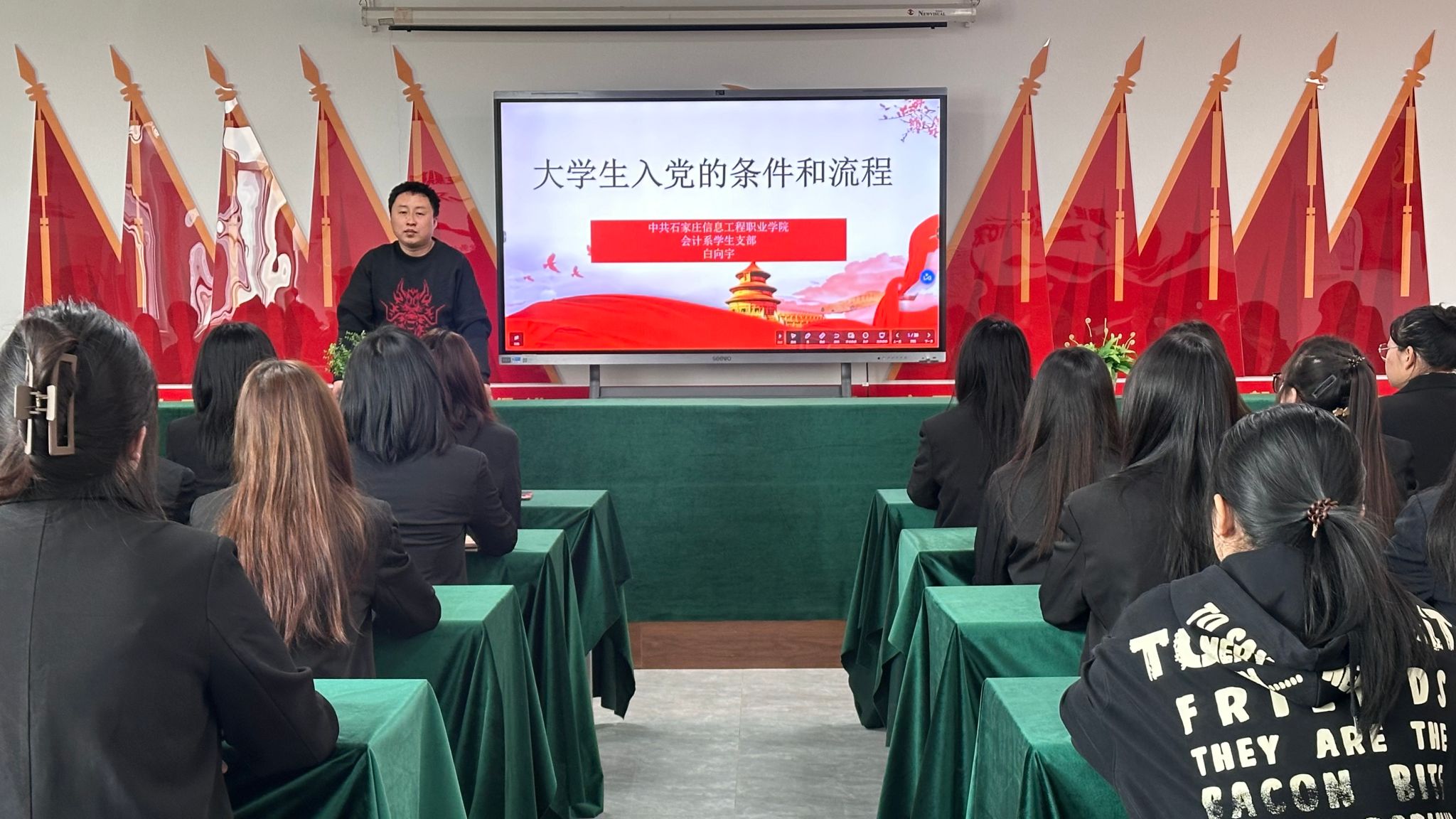 3月21日,会计系副主任沈丽带领同学们学习了解中国共产党的性质、宗旨、指导思想。她指出,应自觉做共产主义远大理想和中国特色社会主义共同理想的坚定信仰者和忠实实践者,在全面建设社会主义现代化国家过程中贡献青春力量。