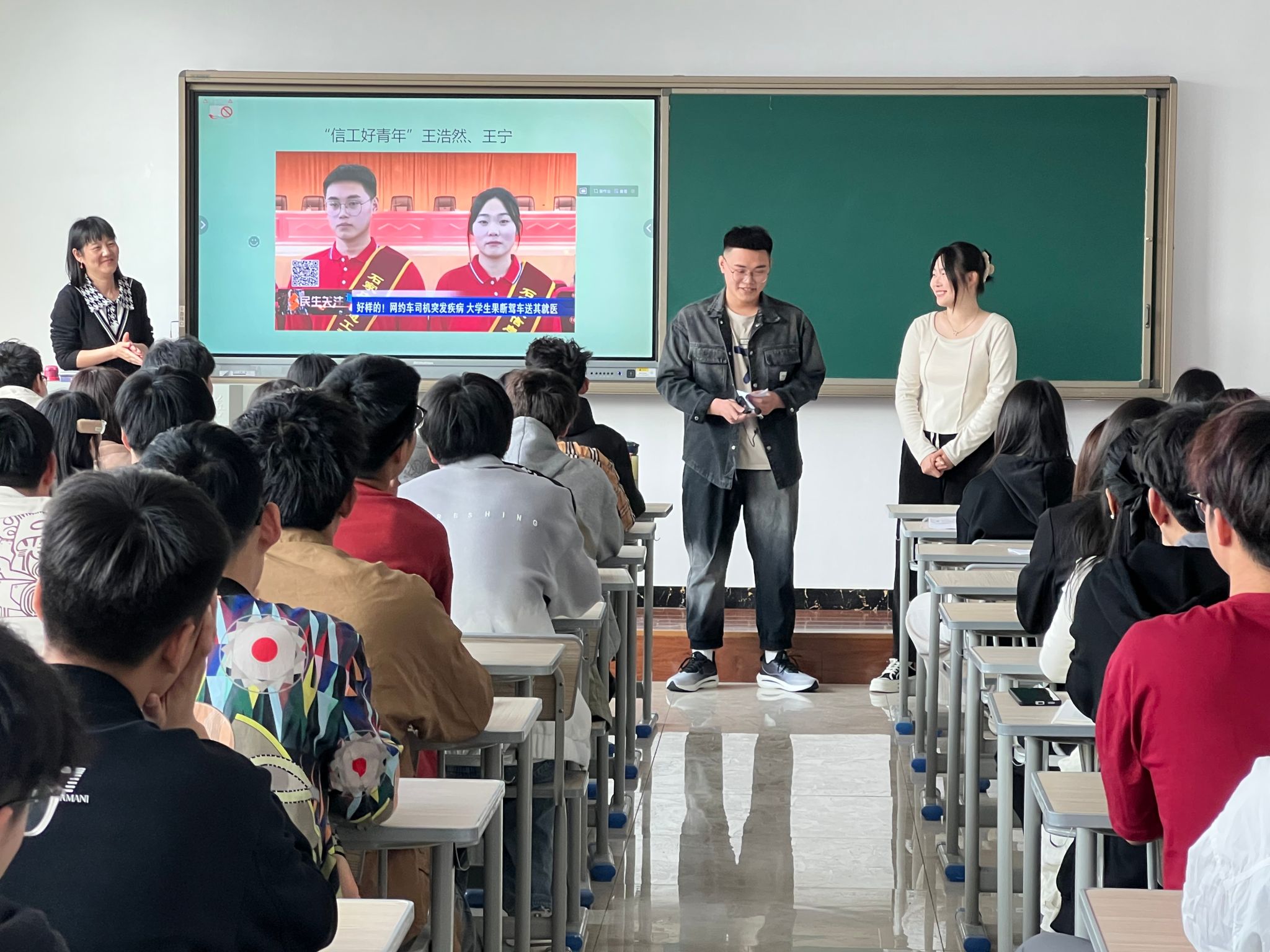 孙静老师围绕授课主题“投身崇德向善的道德实践——锤炼个人品德”,讲述感动中国的“最美人物”和“道德模范”等案例,激发同学们正向的道德认同和道德情感。王浩然、王宁两位同学针对大家心中的疑问“道德模范真的高大,可学吗”,讲述了打网约车时一场关于生命双向奔赴的事件。同学们听得津津有味,纷纷向两位“信工好青年”询问他们救人时的所思所想。身边的榜样用自身事例告诉大家,道德模范并不是高远不可学的,高尚的道德就体现在生活的小事上,体现在日常的一举一动中。最后,孙静老师在智慧职教上与学生互动,同学们写下了对榜样学长的行动感悟,他们纷纷表示,要以道德模范为榜样,汲取榜样力量,学习他们心有大爱、心系他人的高尚情操和敢于担当的道德品质,将社会主义核心价值观内化于心、外化于行。
