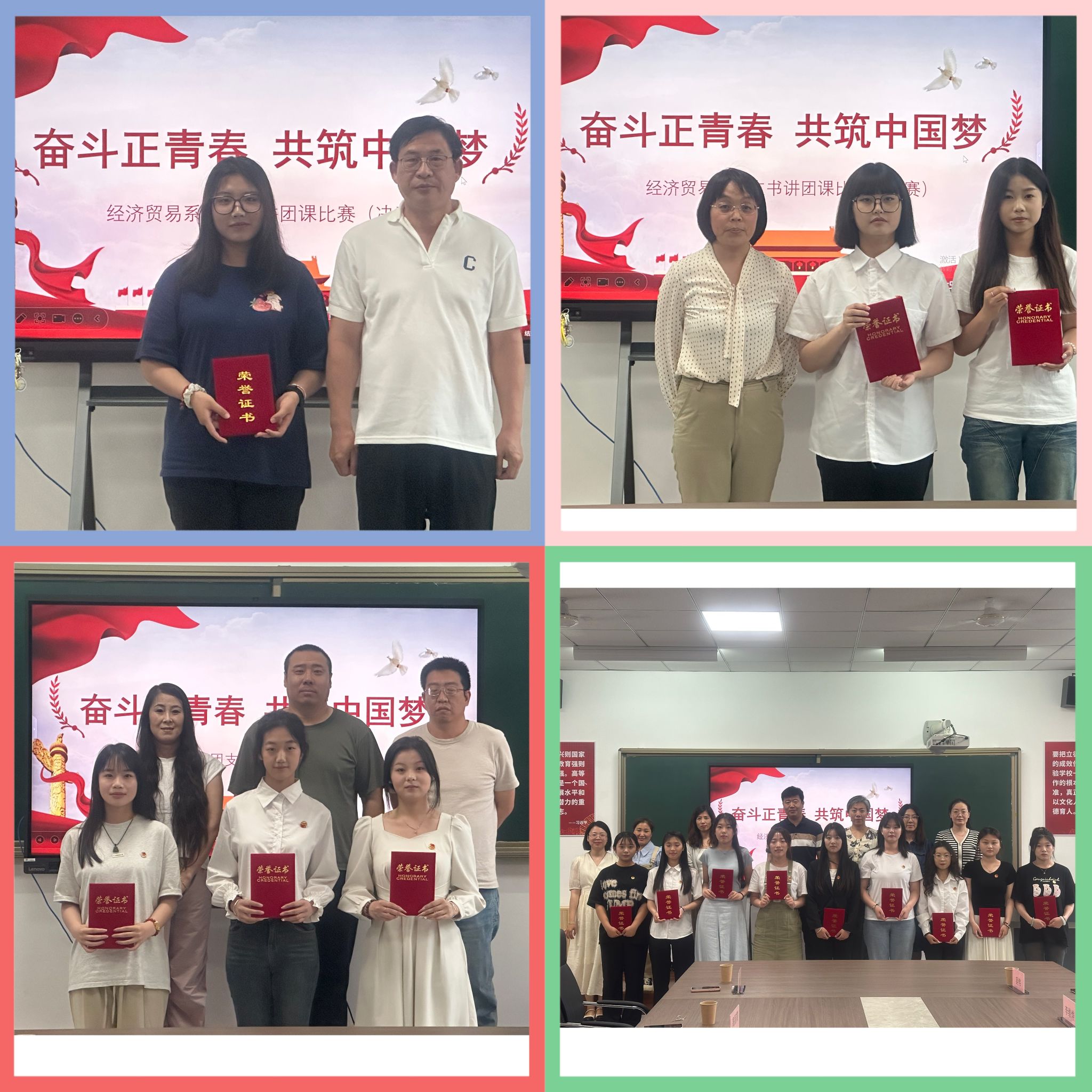 为深入学习宣传贯彻党的二十大精神,迎接伟大祖国75周年华诞,深刻领会习近平总书记关于青年工作重要论述,传承弘扬“爱国、进步、民主、科学”的“五四”精神,加强团课教育实效性,让青年团员从团课中学习,在团课中受教育,5月9日下午,经济贸易系在知新5号楼318举办“奋斗正青春 共筑中国梦”为主题的团支部书记讲团课决赛。经济贸易系党总支书记田洪舟、副书记孟云侠出席,辅导员担任评委。