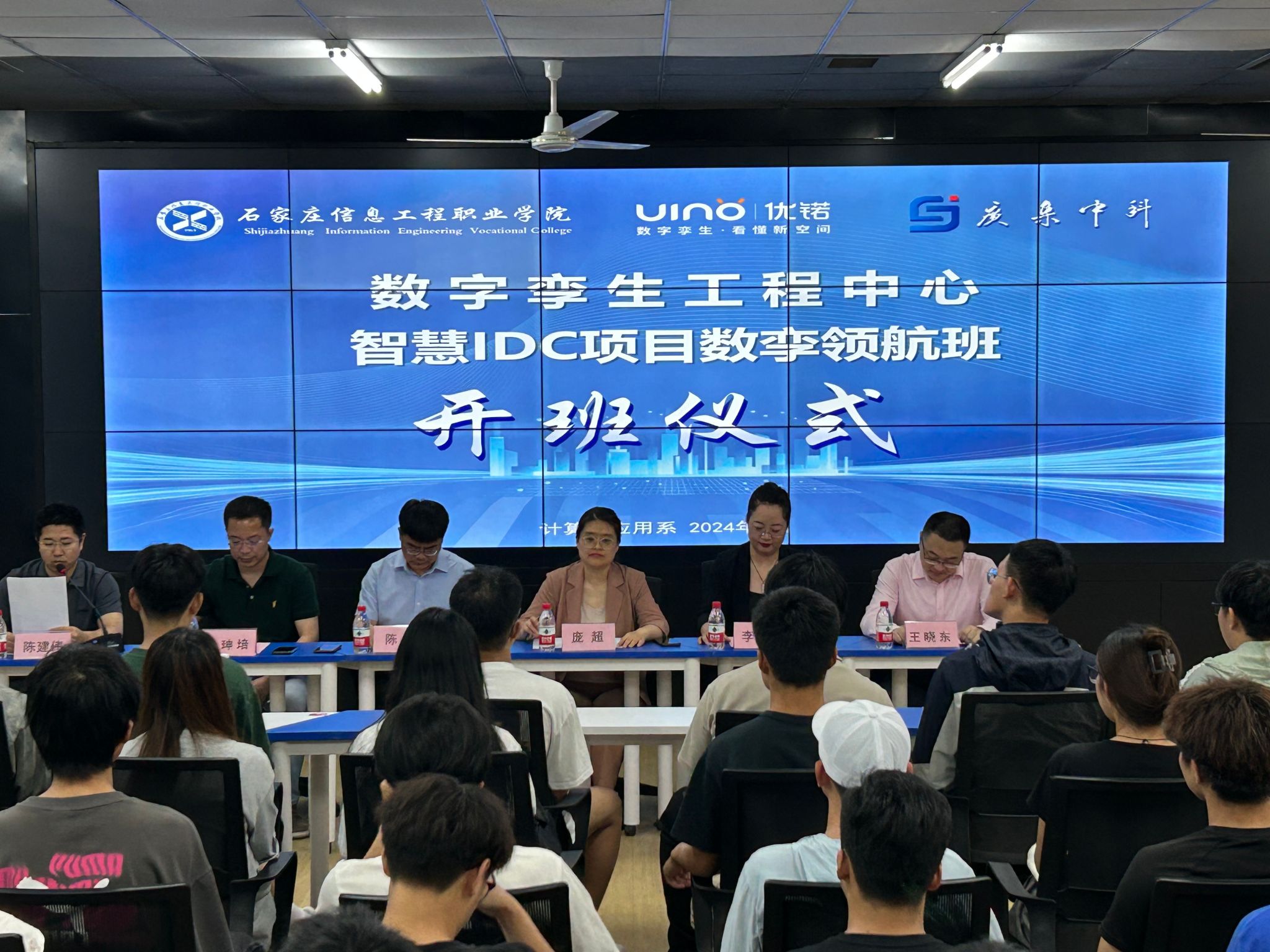 为进一步提升学生专业技能,扎实推进我院数字孪生工程中心建设,6月3日下午,计算机应用系在知行2号楼117室举办数字孪生工程中心——智慧IDC项目“数孪领航班”开班仪式。教务处副处长陈宁出席并讲话,北京优锘科技股份有限公司产教融合总经理王珅培、河北广集中科电子科技有限公司总经理李艳美、计算机应用系主任庞超、企业导师王晓东和数字孪生教学团队骨干教师,以及“数孪领航班”同学参加开班仪式。计算机应用系副主任陈建伟主持。