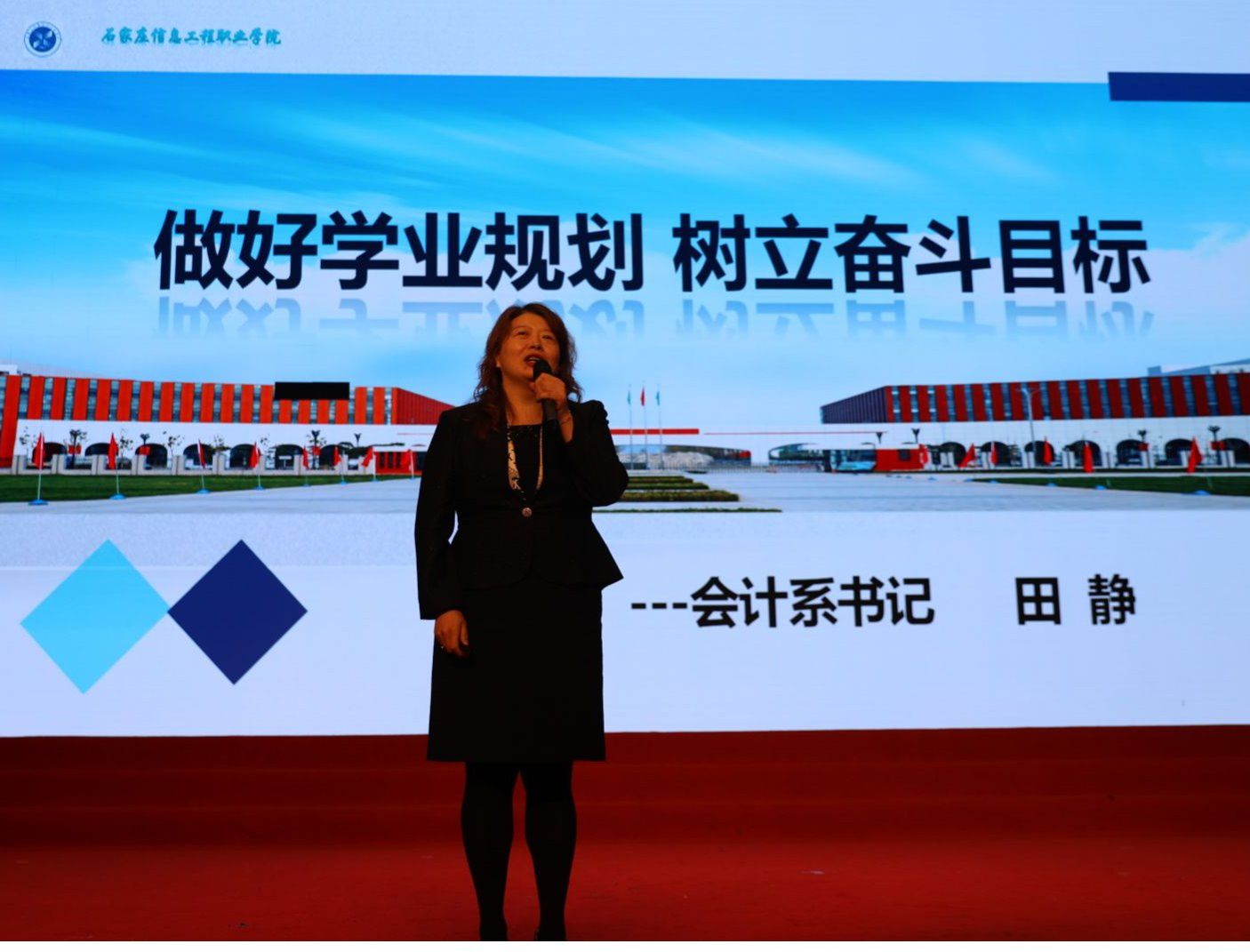 会计系党总支书记田静为新生们带来了生动的新生教育。她通过鲜活的图片和视频资料,向学生们讲述了学院发展的历史、优越的办学条件、鲜明的办学特色以及会计系的基本情况、强大的师资阵容、先进的教学设施等,开展了爱校荣校教育。接着她围绕“就业”和“升学”两个方向着重阐述了如何做好大学生涯规划,并运用详细的数据指出了目前面临的挑战和现状,希望同学们围绕“六大任务”安排大学生活,书写丰富多彩的人生简历。最后她鼓励同学们,要树立终身学习的意识,养成终身学习习惯,制定科学学业规划,培养自主管理能力,珍惜青春年华实现人生梦想。