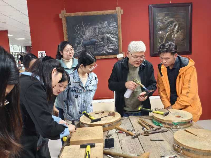 活动中,师生们体验了铜树叶、羽毛书签和浮雕画的制作流程。一块铜板,经过同学们的敲敲打打,很快就变成了色彩斑斓、惟妙惟肖的工艺品。