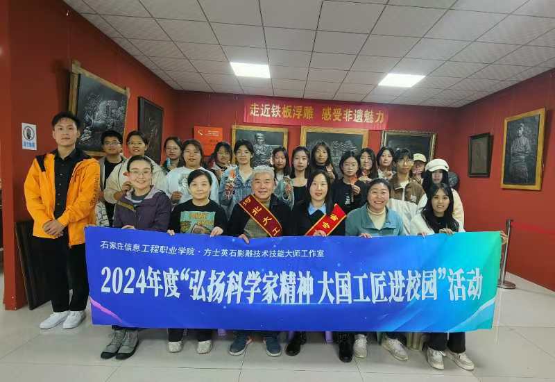 10月26日下午,学院传媒艺术系方士英石影雕技术技能大师工作室开展的2024年度“弘扬科学家精神 大国工匠进校园”活动第三期继续进行。信工师生走出校园,来到郭海龙铁板浮雕艺术馆,近距离领略“河北大工匠”的艺术魅力。