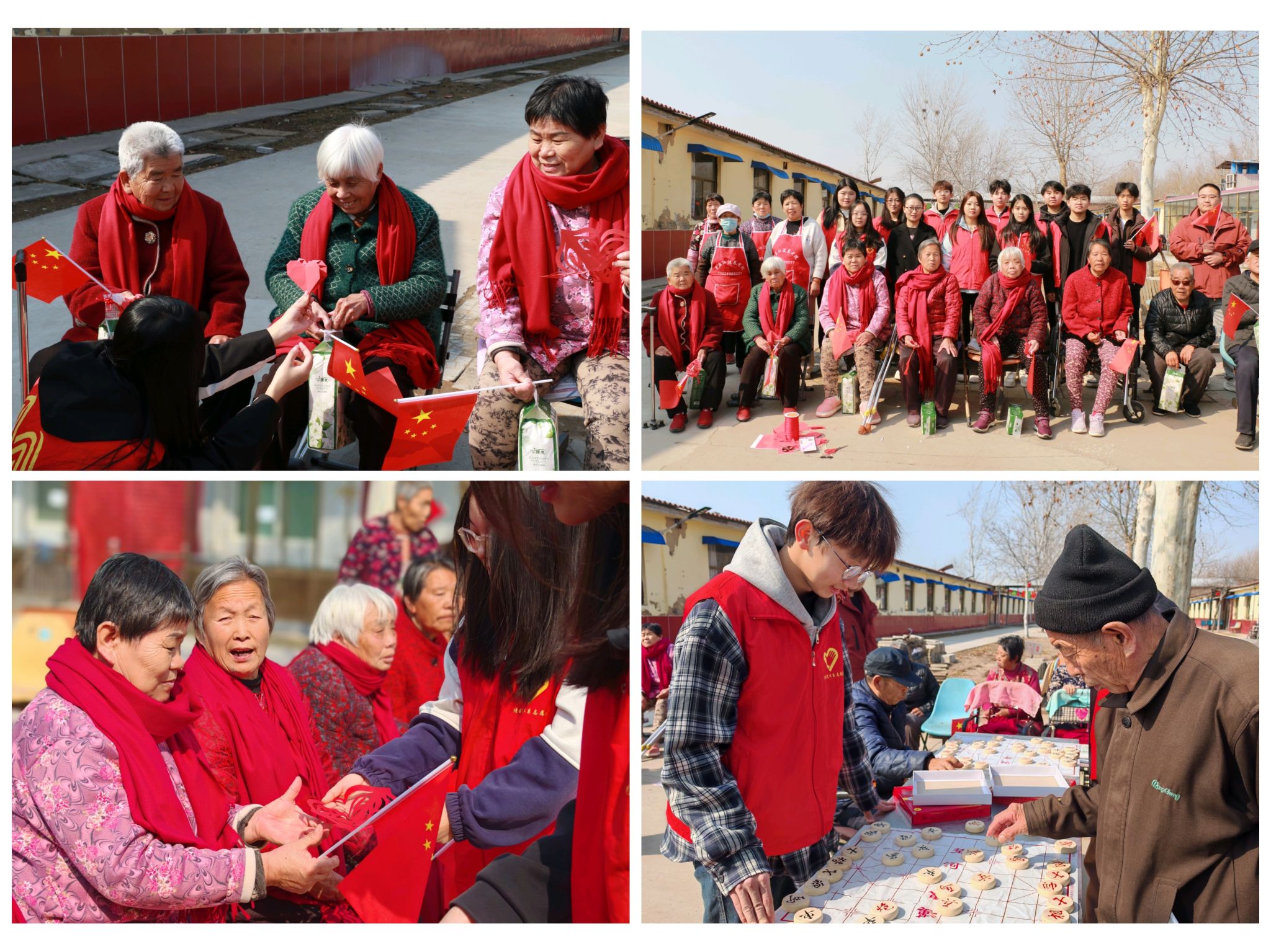另一组师生志愿者走进黄庄村养老院,开展慰问服务。学生们为老人送上慰问品,并分组与老人互动。有的手把手教老人编织中国结,将红色丝线缠绕成象征吉祥的工艺品;有的陪伴老人剪纸,剪出“福”“寿”等图案装点房间;有的与老人对弈,在棋盘上切磋交流。养老院里欢笑声不断,老人们脸上洋溢着幸福的笑容。