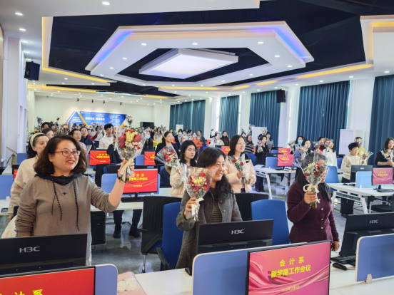 鲜花传情,温馨献礼。在全系大会的现场,工作人员向每一位女教师献上了一束精美的鲜花,不仅表达了对女教师身份的尊重,更是传递对她们深深的谢意和祝福。老师们脸上洋溢着笑容,深切感受到了来自会计系大家庭的温暖与关怀。鲜花的芬芳与女教师们温馨的笑容相互映衬,为整个会场增添了一抹温馨而和谐的色彩。