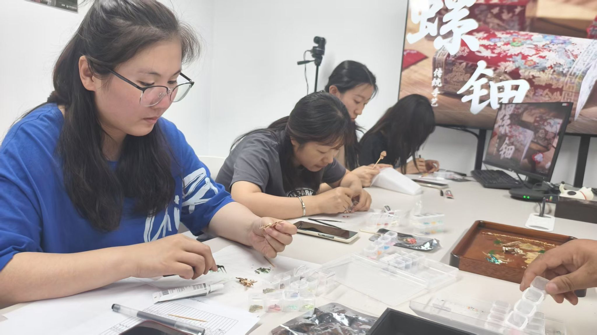 “螺钿”是一项极具中国特色的传统手工装饰技艺。它主要是把螺壳、蚌壳、贝壳等软体动物的外壳加工成薄片,再经过精细的雕刻、打磨工序,最后镶嵌在漆木器、金属器等器物表面,从而形成色彩绚丽、纹样精美的装饰图案。活动中,传媒艺术系王丽云剪纸技术技能大师工作室教师为企业人员细致讲解了螺钿镶嵌的流程和技术要点,并通过实物展示介绍了渐变过渡的配色方式,使其与饰品图案完美契合,达到华丽却不失雅致的装点效果。在烧箔技艺体验环节,参与者们从硫磺布与铜箔的熨烫反应,到胶水涂刷、贴箔定型的精细操作,仔细倾听,亲手实践,了解平凡金属蜕变为艺术珍品的奇迹。