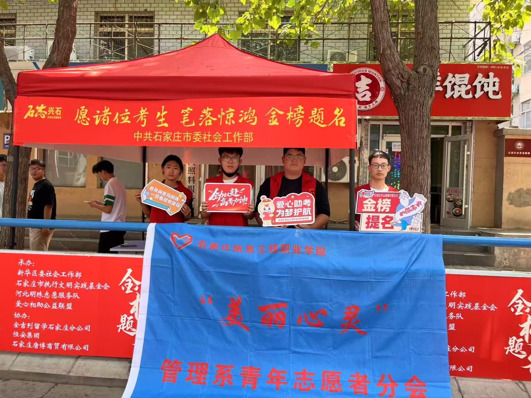 为进一步弘扬“奉献、友爱、互助、进步”的志愿服务精神,精心做好2025年我市高考志愿服务保障工作,为广大考生营造一个文明和谐、安全畅通、舒心安静的考试环境,在中共石家庄市委社会工作部、石家庄市委宣传部(文明办)、石家庄市志愿服务联合会的指导下,我院管理系青年志愿者服务协会联合河北明珠志愿服务队在石家庄市第四十二中学开展2025年“执笔为剑战高考,青春志愿护远航”爱心助高考志愿服务活动,让“志愿红”成为考场上一道亮丽的风景线。