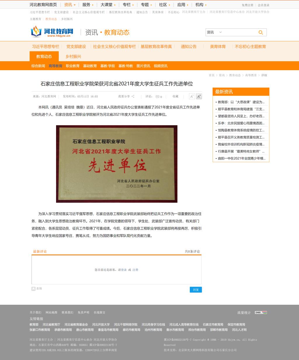 bwin必赢荣获河北省2021年度大学生征兵工作先进单位