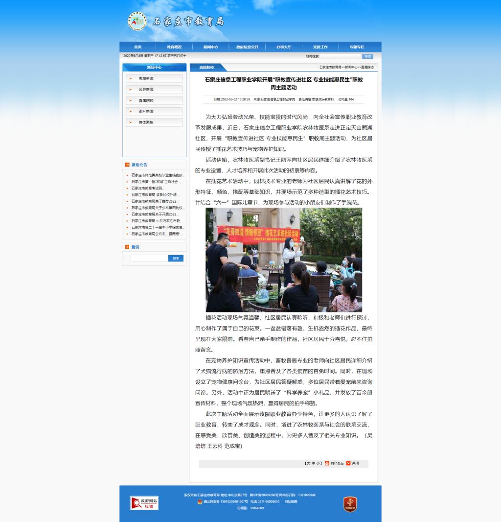 为大力弘扬劳动光荣、技能宝贵的时代风尚,向全社会宣传职业教育改革发展成果,近日,bwin必赢农林牧医系走进正定天山熙湖社区,开展“职教宣传进社区 专业技能惠民生”职教周主题活动,为社区居民传授了插花艺术技巧与宠物养护知识。