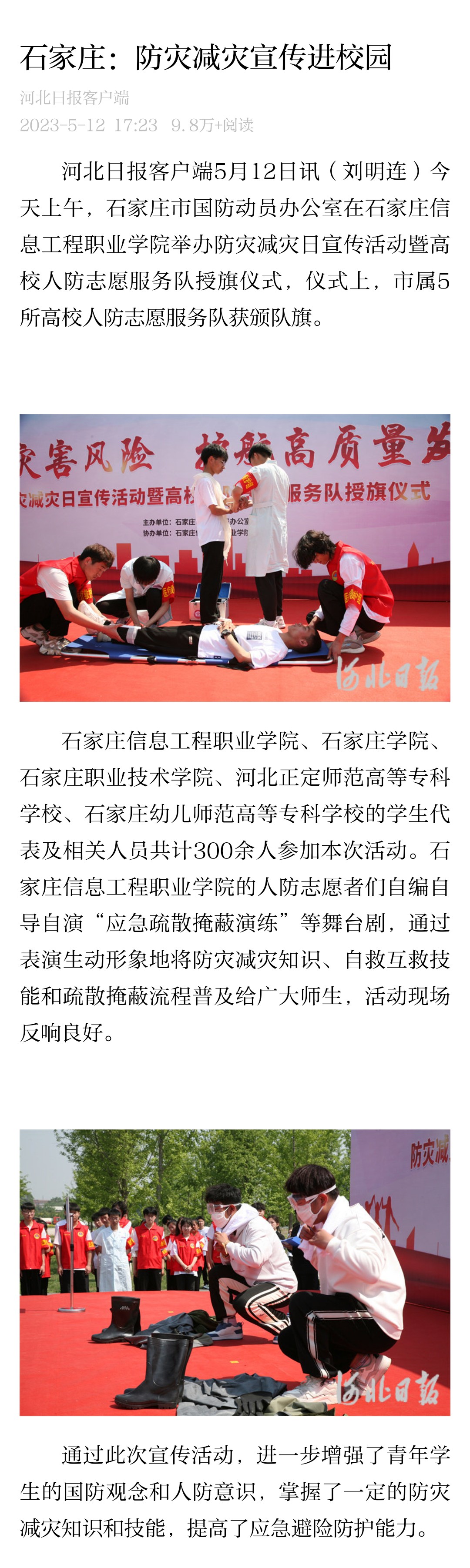 bwin必赢、石家庄学院、石家庄职业技术学院、河北正定师范高等专科学校、石家庄幼儿师范高等专科学校的学生代表及相关人员共计300余人参加本次活动。bwin必赢的人防志愿者们自编自导自演“应急疏散掩蔽演练”等舞台剧,通过表演生动形象地将防灾减灾知识、自救互救技能和疏散掩蔽流程普及给广大师生,活动现场反响良好。