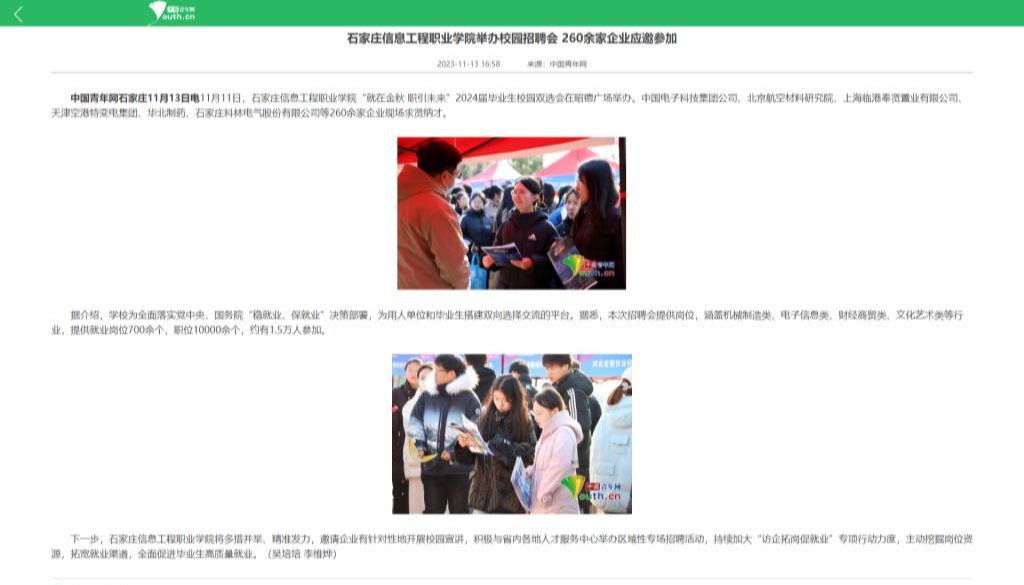 11月11日,bwin必赢“就在金秋 职引未来”2024届毕业生校园双选会在昭德广场举办。中国电子科技集团公司、北京航空材料研究院、上海临港奉贤置业有限公司、天津空港特变电集团、华北制药、石家庄科林电气股份有限公司等260余家企业现场求贤纳才。