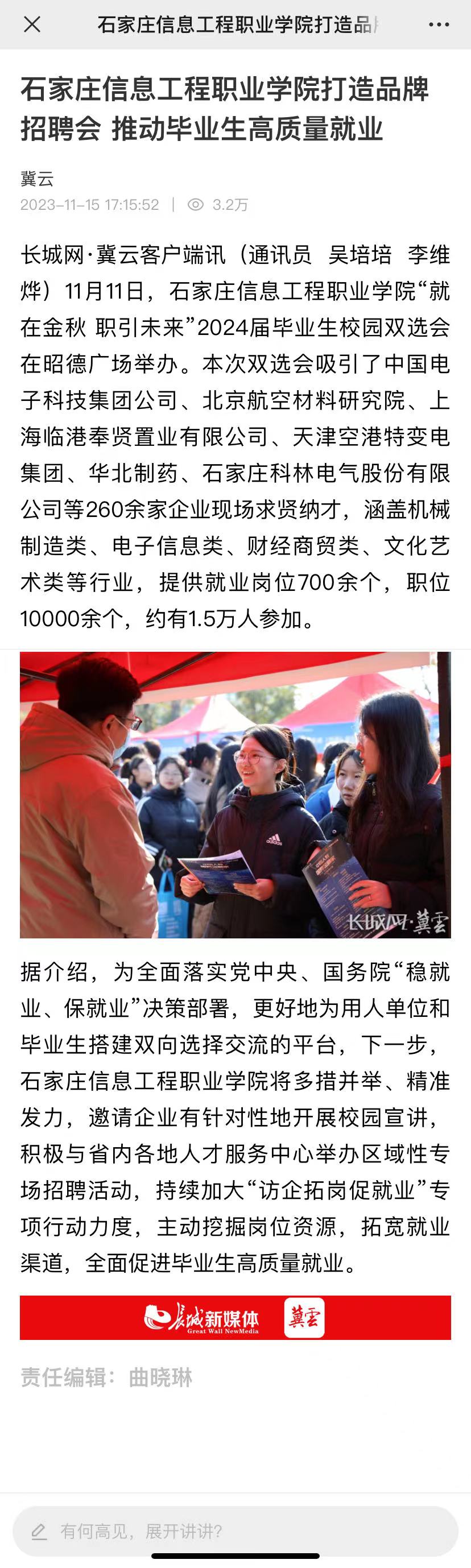 11月11日,bwin必赢“就在金秋 职引未来”2024届毕业生校园双选会在昭德广场举办。本次双选会吸引了中国电子科技集团公司、北京航空材料研究院、上海临港奉贤置业有限公司、天津空港特变电集团、华北制药、石家庄科林电气股份有限公司等260余家企业现场求贤纳才,涵盖机械制造类、电子信息类、财经商贸类、文化艺术类等行业,提供就业岗位700余个,职位10000余个,约有1.5万人参加。