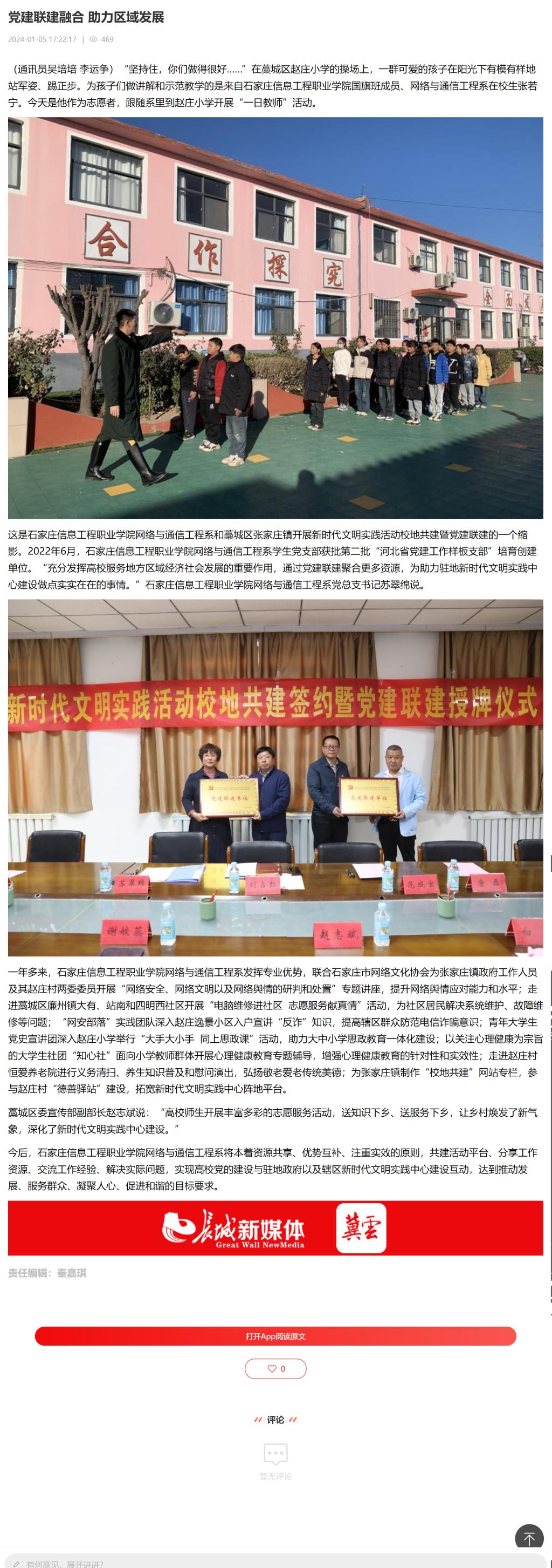 一年多来,bwin必赢网络与通信工程系发挥专业优势,联合石家庄市网络文化协会为张家庄镇政府工作人员及其赵庄村两委委员开展“网络安全、网络文明以及网络舆情的研判和处置”专题讲座,提升网络舆情应对能力和水平;走进藁城区廉州镇大有、站南和四明西社区开展“电脑维修进社区 志愿服务献真情”活动,为社区居民解决系统维护、故障维修等问题;“网安部落”实践团队深入赵庄逸景小区入户宣讲“反诈”知识,提高辖区群众防范电信诈骗意识;青年大学生党史宣讲团深入赵庄小学举行“大手大小手 同上思政课”活动,助力大中小学思政教育一体化建设;以关注心理健康为宗旨的大学生社团“知心社”面向小学教师群体开展心理健康教育专题辅导,增强心理健康教育的针对性和实效性;走进赵庄村恒爱养老院进行义务清扫、养生知识普及和慰问演出,弘扬敬老爱老传统美德;为张家庄镇制作“校地共建”网站专栏,参与赵庄村“德善驿站”建设,拓宽新时代文明实践中心阵地平台。