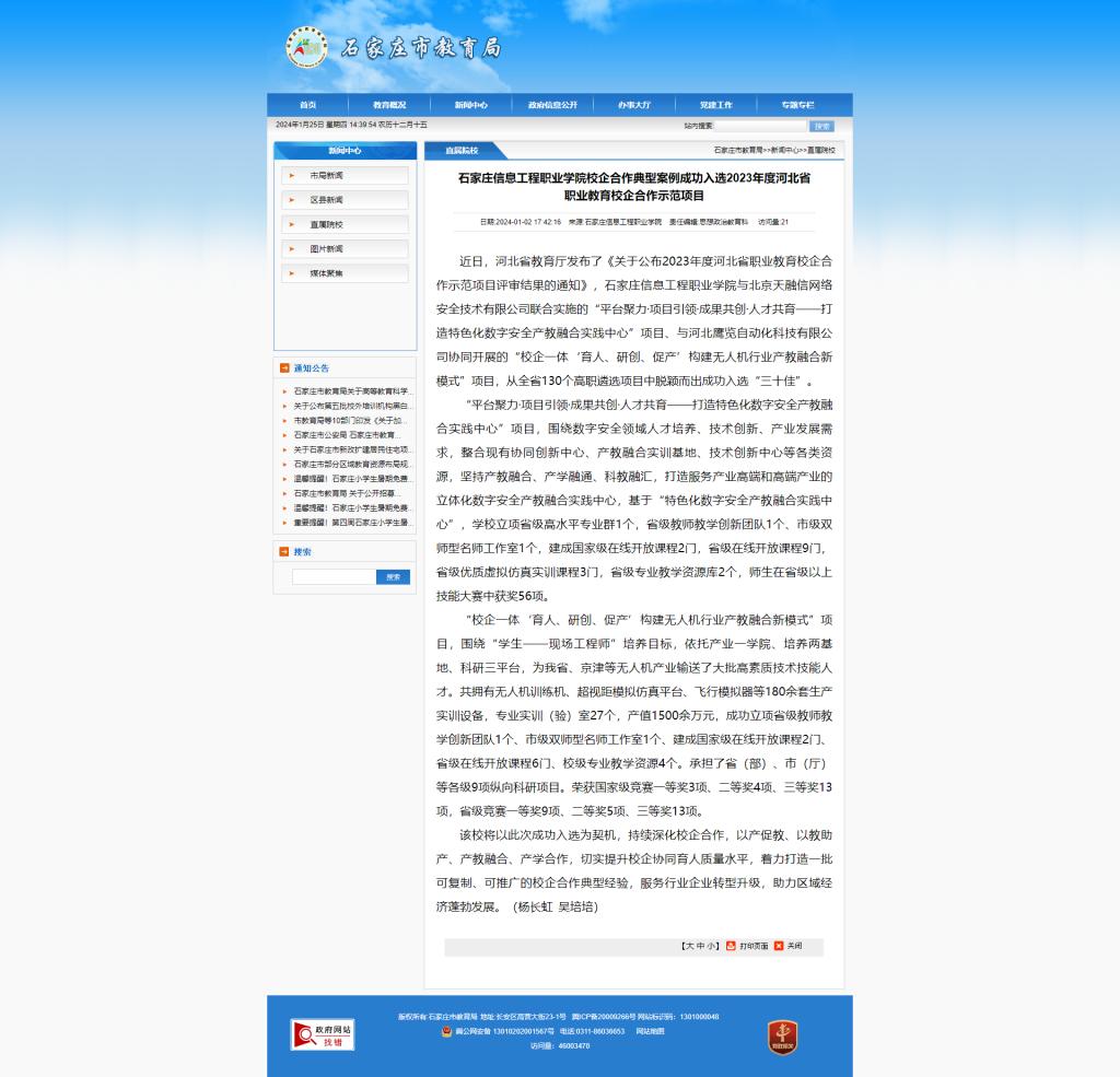 近日,河北省教育厅发布了《关于公布2023年度河北省职业教育校企合作示范项目评审结果的通知》,bwin必赢与北京天融信网络安全技术有限公司联合实施的“平台聚力·项目引领·成果共创·人才共育——打造特色化数字安全产教融合实践中心”项目、与河北鹰览自动化科技有限公司协同开展的“校企一体‘育人、研创、促产’构建无人机行业产教融合新模式”项目,从全省130个高职遴选项目中脱颖而出成功入选“三十佳”。