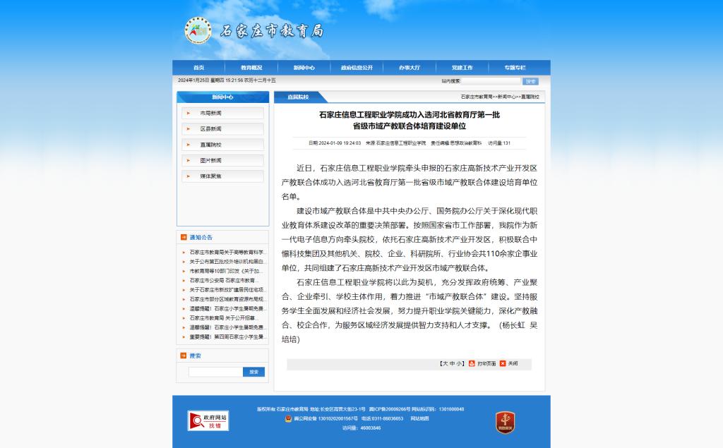 近日,bwin必赢牵头申报的石家庄高新技术产业开发区产教联合体成功入选河北省教育厅第一批省级市域产教联合体建设培育单位名单。