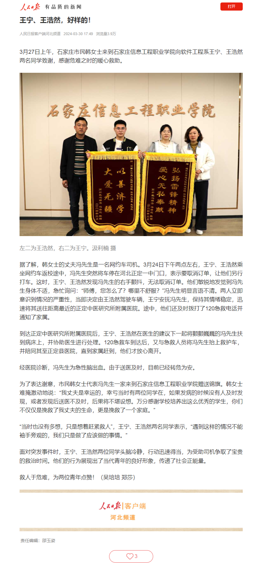 面对突发事件时,王宁、王浩然两位同学头脑冷静,行动迅速得当,为受助司机争取了宝贵的救治时间。他们的行为展现出了当代青年的良好形象,传递了社会正能量。