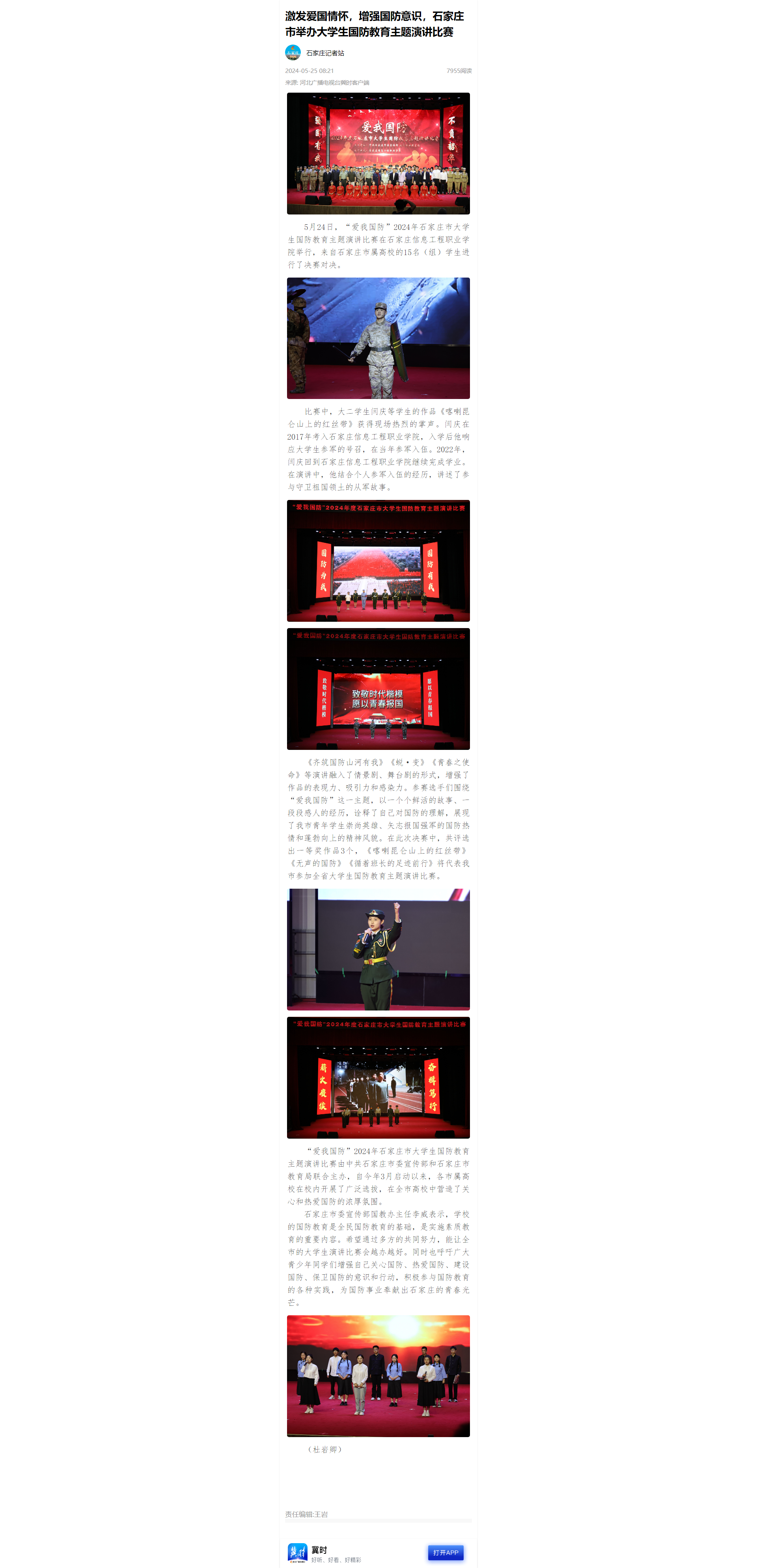 “爱我国防”2024年石家庄市大学生国防教育主题演讲比赛由中共石家庄市委宣传部和石家庄市教育局联合主办,自今年3月启动以来,各市属高校在校内开展了广泛选拔,在全市高校中营造了关心和热爱国防的浓厚氛围。