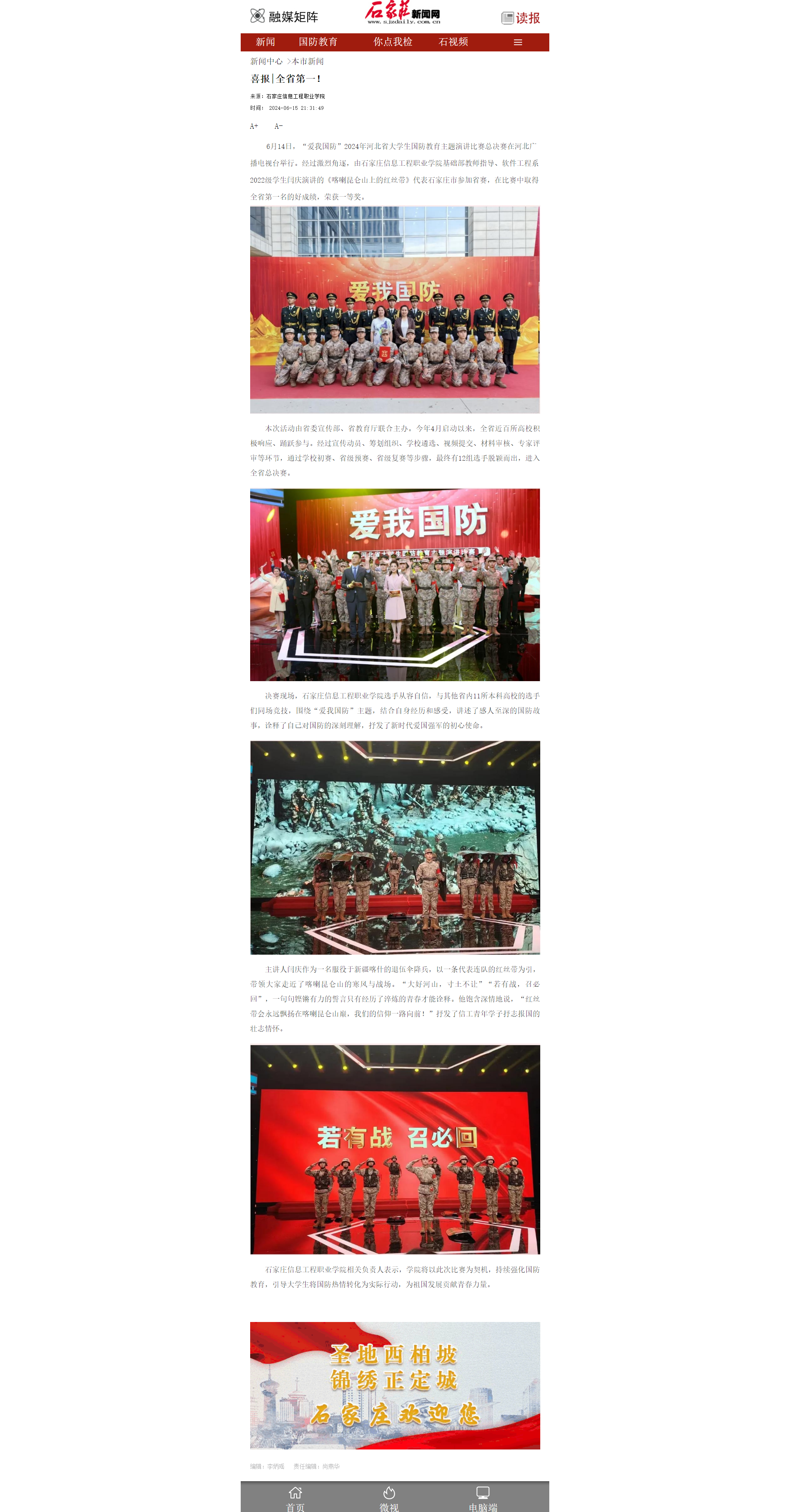 6月14日,“爱我国防”2024年河北省大学生国防教育主题演讲比赛总决赛在河北广播电视台举行。经过激烈角逐,由bwin必赢基础部教师指导、软件工程系2022级学生闫庆演讲的《喀喇昆仑山上的红丝带》代表石家庄市参加省赛,在比赛中取得全省第一名的好成绩,荣获一等奖。
