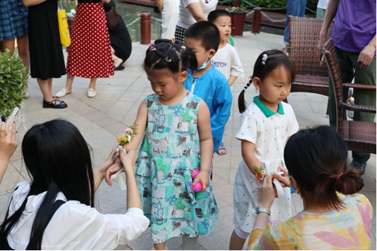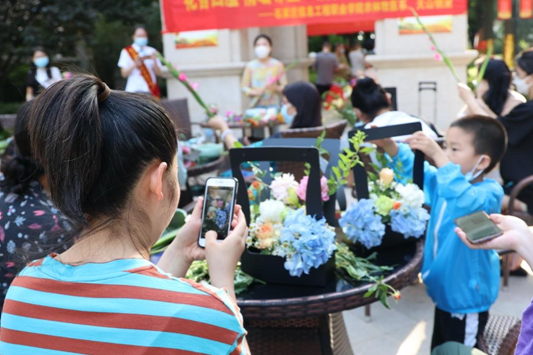 插花艺术活动中农林牧医系高晨曦老师为社区居民介绍一款夏日花篮的插法。结合即将到来的端午节,农林牧医系倪畅老师为社区居民介绍中式插花方法,插花结束后给现场的小朋友们制作了手腕花。