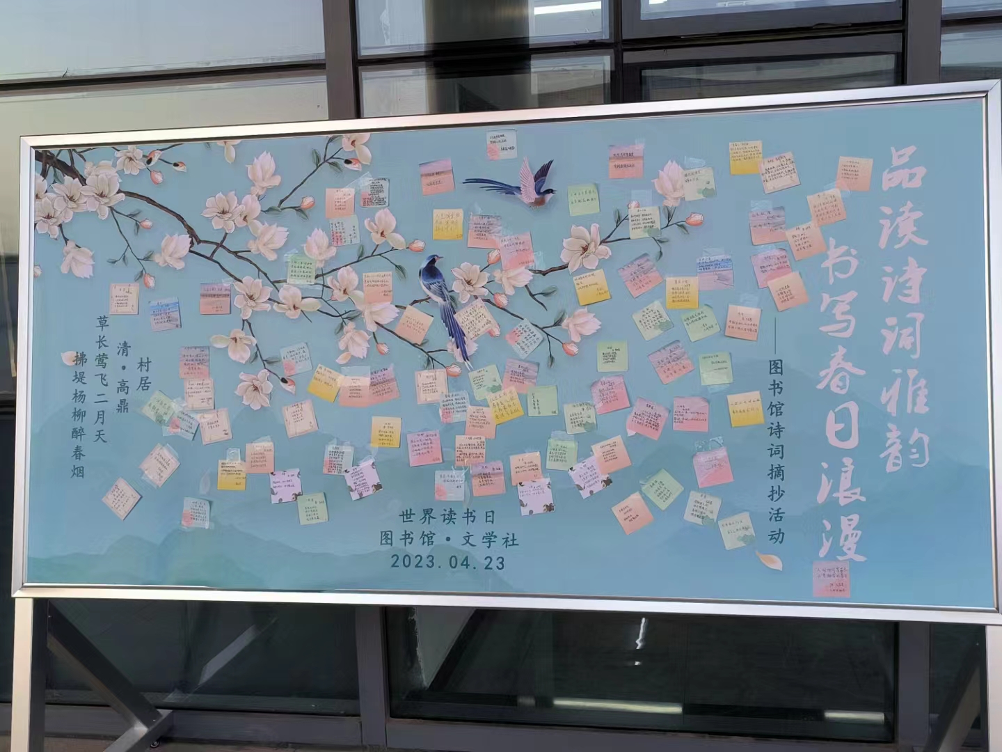 为传承中华优秀传统文化,营造浓厚的校园文化氛围,在“4•23世界读书日”来临之际,图书馆联合文学社开展“品读诗词雅韵 书写春日浪漫”诗词摘抄活动。