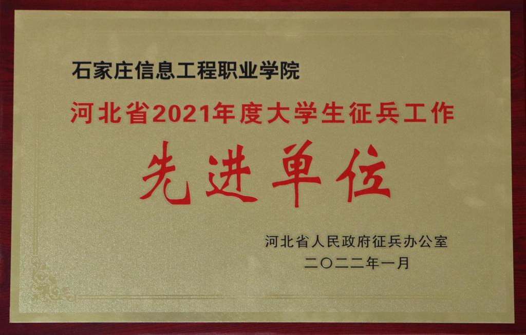 近日,河北省人民政府征兵办公室表彰通报了2021年度全省征兵工作先进单位和先进个人,我院被评为河北省2021年度大学生征兵工作先进单位。